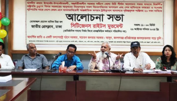 সংবাদ সম্মেলনে লিখিত বক্তব্য পাঠ করেন সিটিজেনস রাইটস মুভমেন্টের মহাসচিব তুষার রেহমান। এ সময় অন্তর্বর্তীকালীন সরকারের কাছে ২০ দফা দাবি পেশ করা হয়। উল্লেখযোগ্য দাবিগুলো হলো— রাষ্ট্রপতি মো. সাহাবুদ্দিনকে অপসারণ, দলীয় বিবেচনায় নিয়োগপ্রাপ্ত বিচারপতিদের অপসারণসহ সিইসি ও সহযোগী অপরাধী ইসিদের স্পেশাল ট্রাইব্যুনালে বিচারের মাধ্যমে শাস্তির ব্যবস্থা করা।