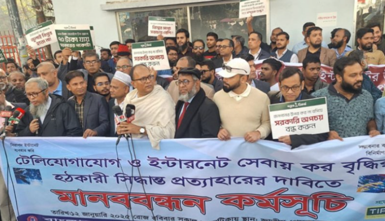 রবিবার (১২ জানুয়ারি) জাতীয় প্রেস ক্লাবের সামনে বাংলাদেশ মুঠোফোন গ্রাহক অ্যাসোসিয়েশন আয়োজিত ‘টেলিযোগাযোগ ও ইন্টারনেট সেবায় কর বৃদ্ধির হঠকারী সিদ্ধান্ত প্রত্যাহারের’ দাবিতে মানববন্ধনে এমন ঘোষণা দেওয়া হয়।