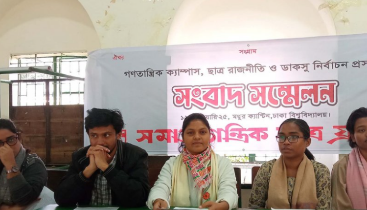 রবিবার (১২ জানুয়ারি) দুপুরে ঢাকা বিশ্ববিদ্যালয়ের মধুর ক্যান্টিনে ‘গণতান্ত্রিক ক্যাম্পাস, ছাত্র রাজনীতি ও ডাকসু নির্বাচন প্রসঙ্গে’ সংগঠনটি আয়েজিত সংবাদ সম্মেলনে কেন্দ্রীয় সভাপতি মুক্তা বাড়ৈ এ দাবি তুলে ধরেন।
