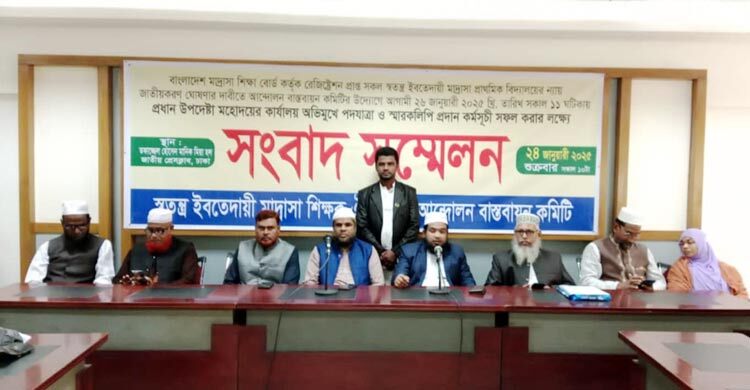 শুক্রবার (২৪ জানুয়ারি) জাতীয় প্রেস ক্লাবের তফাজ্জল হোসেন মানিক মিয়া হলে স্বতন্ত্র ইবতেদায়ি মাদরাসা শিক্ষক ঐক্যজোট আন্দোলন বাস্তবায়ন কমিটি আয়োজিত সংবাদ সম্মেলনে নতুন এই কর্মসূচি ঘোষণা করা হয়।