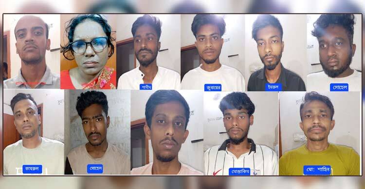 গ্রেফতাররা হলেন- মো. রাকিবুল হাসান শান্ত (২৮), মোছা. খাদিজা বেগম, মো. শামীম (২৫), জুবায়ের হাসান (২২), মো. ইমরুল খান (২৩), সোহেল রানা (৩০), কামরুল ইসলাম (৪০), সোহেল রানা (৩০), মো. রবিউল হাসান (২২), মো. মোস্তাকিম (২১) ও মো. শাহীন (৩৫)।