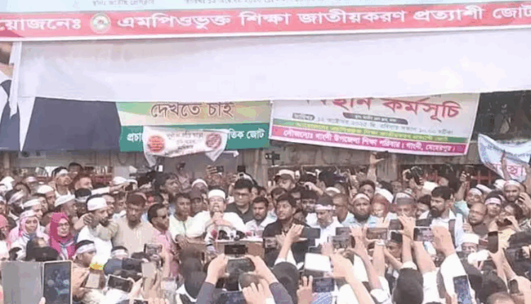 রোববার (১২ অক্টোবর) দুপুর পৌনে ১টার দিকে জাতীয় প্রেস ক্লাবের সামনে শিক্ষকদের অবস্থান কর্মসূচি থেকে এ ঘোষণা দেন এমপিওভুক্ত শিক্ষা জাতীয়করণপ্রত্যাশী জোটের সদস্যসচিব অধ্যক্ষ দেলোয়ার হোসেন আজিজী।