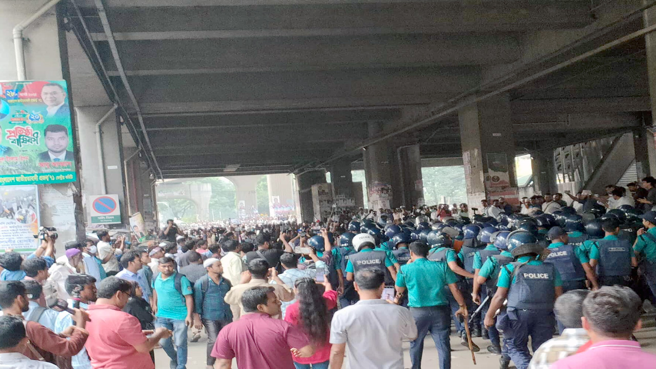 এর আগে থেকেই পুলিশ শিক্ষকদের সরাতে প্রেসক্লাবের অভিমুখে যেতে থাকে। এ সময় আন্দোলনরত শিক্ষকরা পুলিশদের উদ্দেশ্য ভুয়া ভুয়া স্লোগান দিতে থাকেন।
