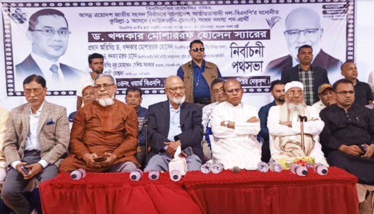 ড. মোশাররফ হোসেন বলেন, বিএনপি অতীতে ক্ষমতায় থাকাকালে দেশ ও জনগণের উন্নয়নে প্রশংসনীয় ভূমিকা রেখেছে। দলটি যখনই ক্ষমতায় ছিল, মানুষ সুখ-স্বাচ্ছন্দ্যে ও নিরাপদে ছিল। তাই জনগণ ধানের শীষে ভোট দিতে মুখিয়ে আছে। আগামী নির্বাচনে জনগণ বিপুল ভোটে বিএনপির প্রার্থীদের নির্বাচিত করবে।