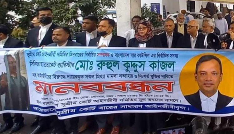 সুপ্রিম কোর্ট আইনজীবী সমিতির নির্বাচনের ভোট গণনাকে কেন্দ্র করে মারামারি ও হত্যাচেষ্টার অভিযোগে দায়ের করা মামলায় বিএনপি-সমর্থিত প্যানেলের সম্পাদপ্রার্থী ব্যারিস্টার রুহুল কুদ্দুস কাজলসহ আইনজীবীদের মুক্তির দাবিতে মানববন্ধন করেছেন বিএনপি সমর্থিত আইনজীবীরা।
