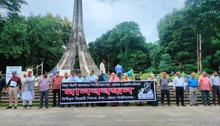 কোটা সংস্কার আন্দোলনকারী শিক্ষার্থীদের হত্যা, গুম গ্রেপ্তারের প্রতিবাদে মানববন্ধন ও র্যালি করেছেন নিপীড়নবিরোধী শিক্ষক ঐক্য, চট্টগ্রাম বিশ্ববিদ্যালয়ের (চবি) শিক্ষকরা।