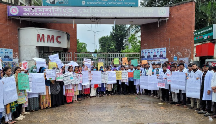 বৈষম্যবিরোধী ছাত্র আন্দোলনের ডাকে সাড়া দিয়ে ময়মনসিংহ মেডিক্যাল কলেজ শিক্ষার্থীদের বিক্ষোভ