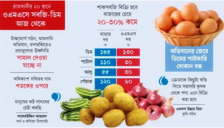 রাজধানীর ২০ স্থানে আজ মঙ্গলবার থেকেই ওএমএসের আওতায় বিভিন্ন সবজি বিক্রি শুরু হচ্ছে। সবজির পাশাপাশি আলু, ডিম, পেঁয়াজও কিনতে পারবেন ক্রেতারা। এ ব্যাপারে কৃষি সচিব ড. মোহাম্মদ এমদাদ উল্লাহ মিয়ান বলেন, নির্দিষ্ট আয়ের মানুষকে কিছুটা স্বস্তি দিতে আমরা প্রথমবারের মতো সবজি নগরের বিভিন্ন স্পটে বিক্রি করতে যাচ্ছি। ভর্তুকি দরে এসব পণ্য বিক্রি করা হবে। আজ বেলা ১১টায় খাদ্য অধিদপ্তরে বিক্রি কার্যক্রমের উদ্বোধন অনুষ্ঠানে কৃষি মন্ত্রণালয়ের উপদেষ্টা লেফটেন্যান্ট জেনারেল (অব.) মো. জাহাঙ্গীর আলম চৌধুরী ও বাণিজ্য মন্ত্রণালয়ের উপদেষ্টা ড. সালেহউদ্দিন আহমেদ উপস্থিত থাকবেন।