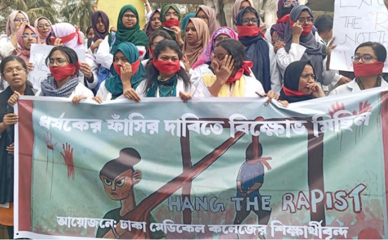 সারা দেশে অব্যাহত ধর্ষণের প্রতিবাদ ও ধর্ষকদের ফাঁসির দাবিতে বিক্ষোভ মিছিল ও সমাবেশ করেছে ঢাকা মেডিক্যাল কলেজের (ঢামেক) শিক্ষার্থীরা। রবিবার (৯ মার্চ) ঢাকা বিশ্ববিদ্যালয়ের (ঢাবি) রাজু ভাস্কর্যের পাদদেশে এ বিক্ষোভ সমাবেশ অনুষ্ঠিত হয়।