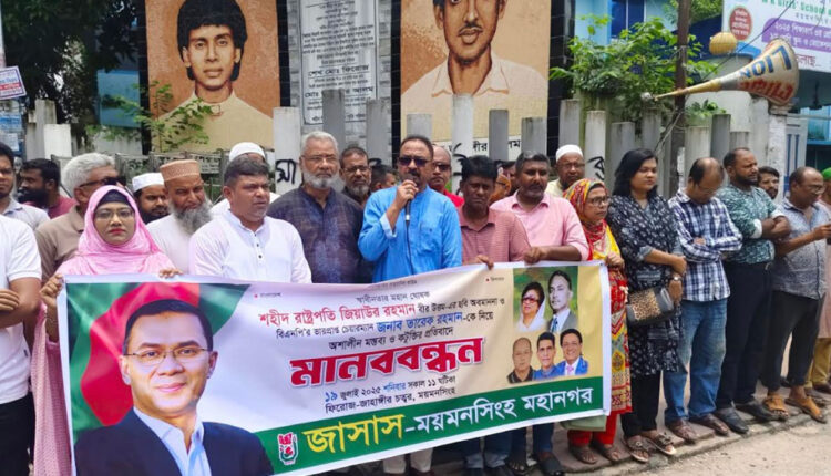 শনিবার (১৯ জুলাই) দুপুর ১২টায় ময়মনসিংহ নগরীর ফিরোজ-জাহাঙ্গীর চত্বরে শহীদ প্রেসিডেন্ট জিয়াউর রহমানের ছবি অপমান এবং তারেক রহমানকে নিয়ে কটুক্তির প্রতিবাদে মহানগর জাসাস আয়োজিত মানববন্ধনে বিএনপি নেতারা এই হুঁশিয়ারি উচ্চারণ করেন। এতে প্রধান অতিথির বক্তব্য রাখেন বিএনপির নির্বাহী কমিটির সহসাংগঠনিক সম্পাদক আবু ওয়াহাব আকন্দ ওয়াহিদ।